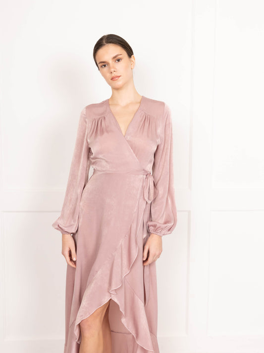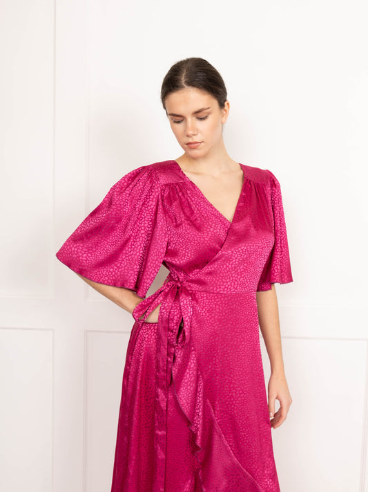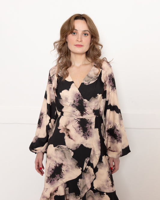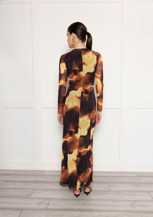 • Flounce London Maxi Dress in Purple and Orange Blurred Print