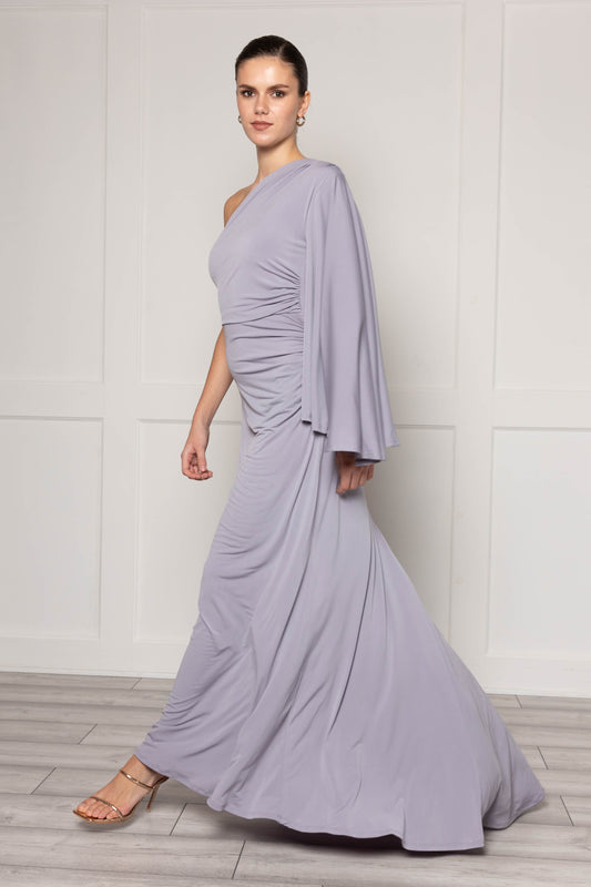 • One Shoulder Maxi Dress With Sleeve And Fishtail Skirt In Grey
