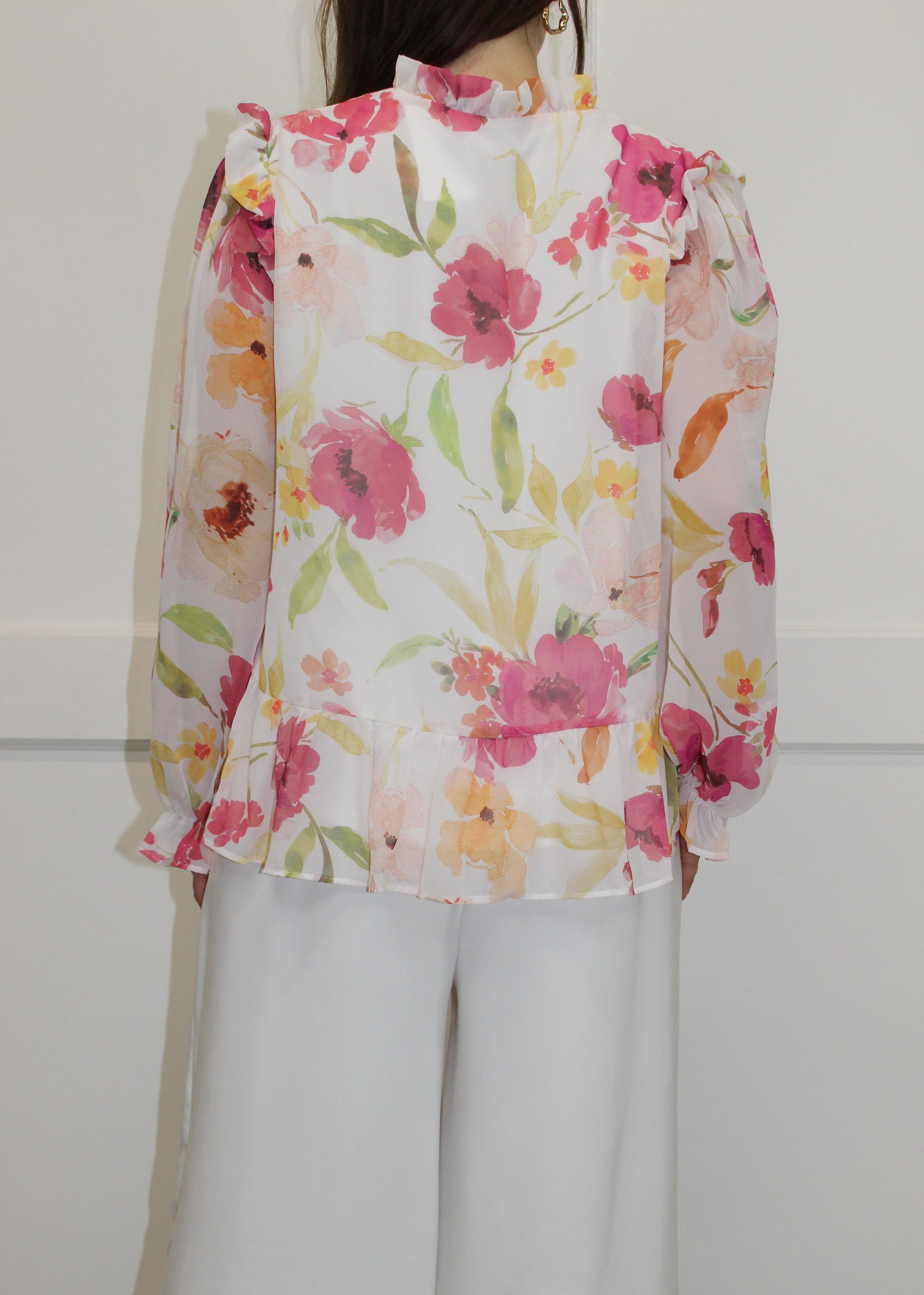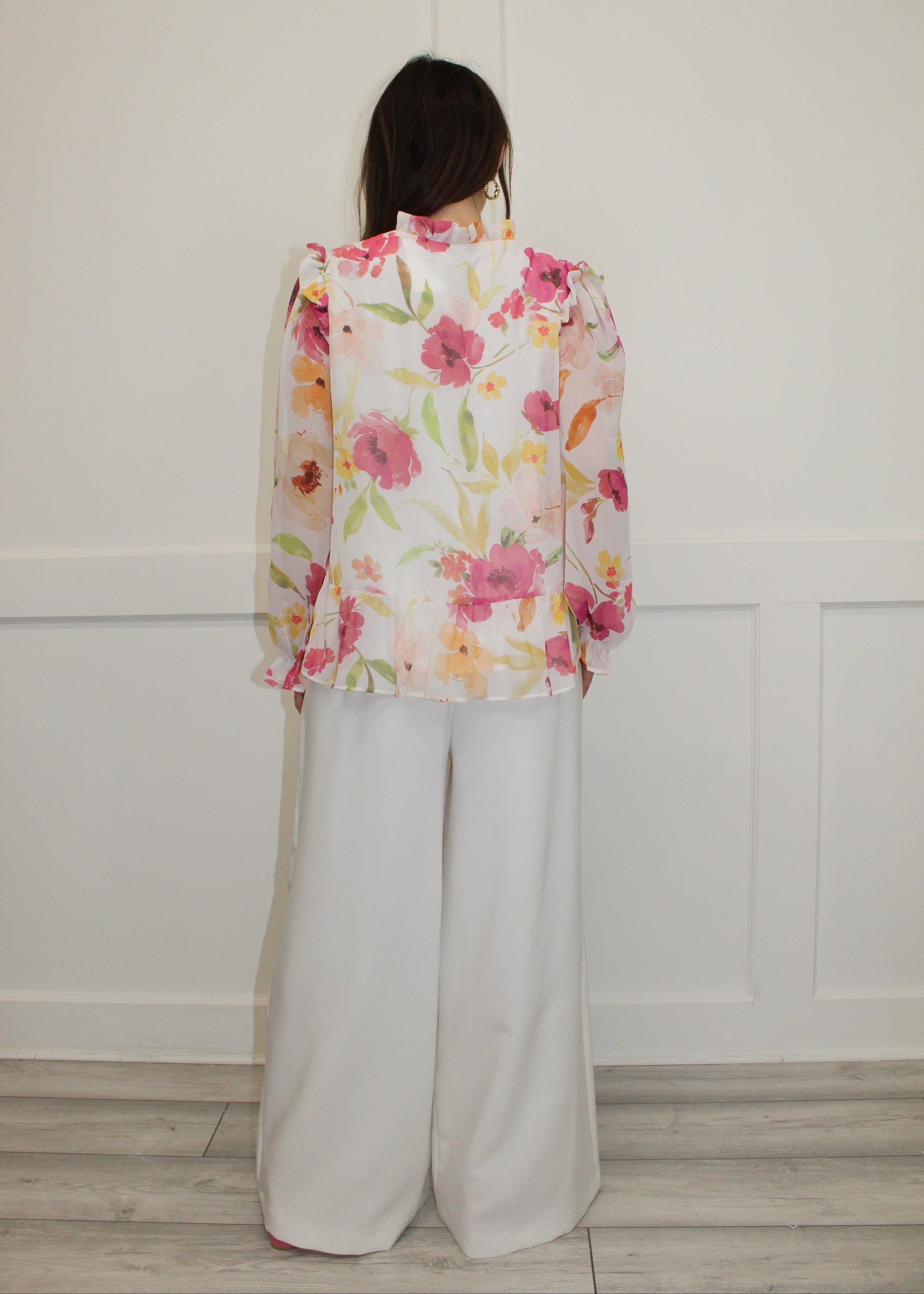 Flounce London frill blouson sleeve blouse in pink and cream multi floral printed chiffon. The blouse features frill neck with tie, elasticated cuff, frill hem and shoulder detailing. Pair with your favourite trouser and heel for the perfect office to drinks look.