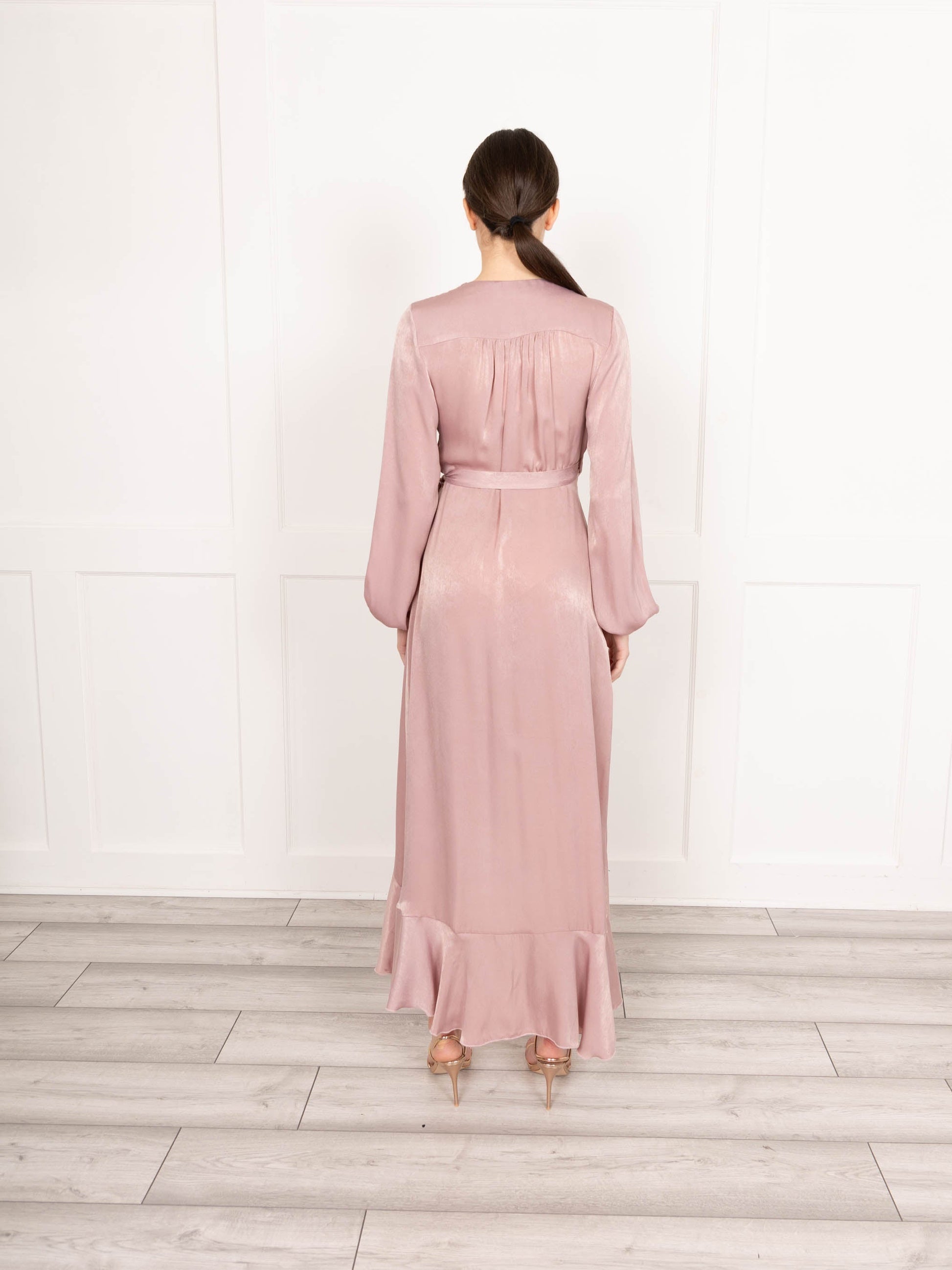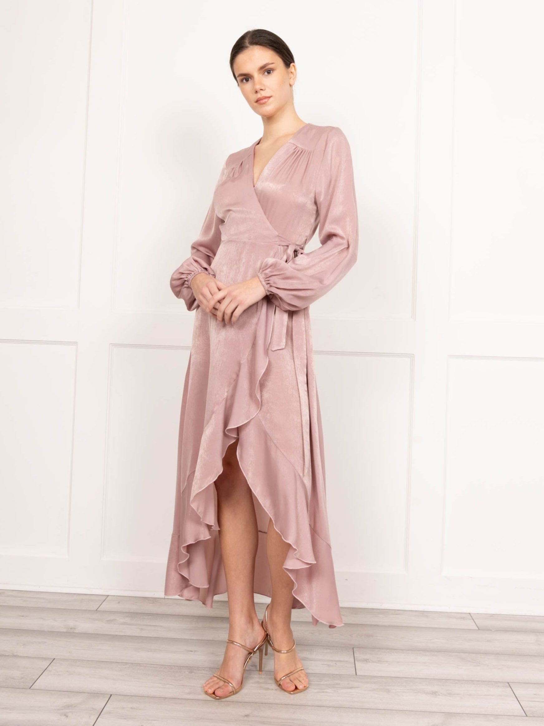 Flounce London wrap midaxi dress in soft, silky blush satin. This dress features a wrap bust, long puff sleeve, wrap high-low skirt and frill detail. You'll be turning heads in this dreamy maxi wrap dress that'll have you feeling amazing every time you wear it!