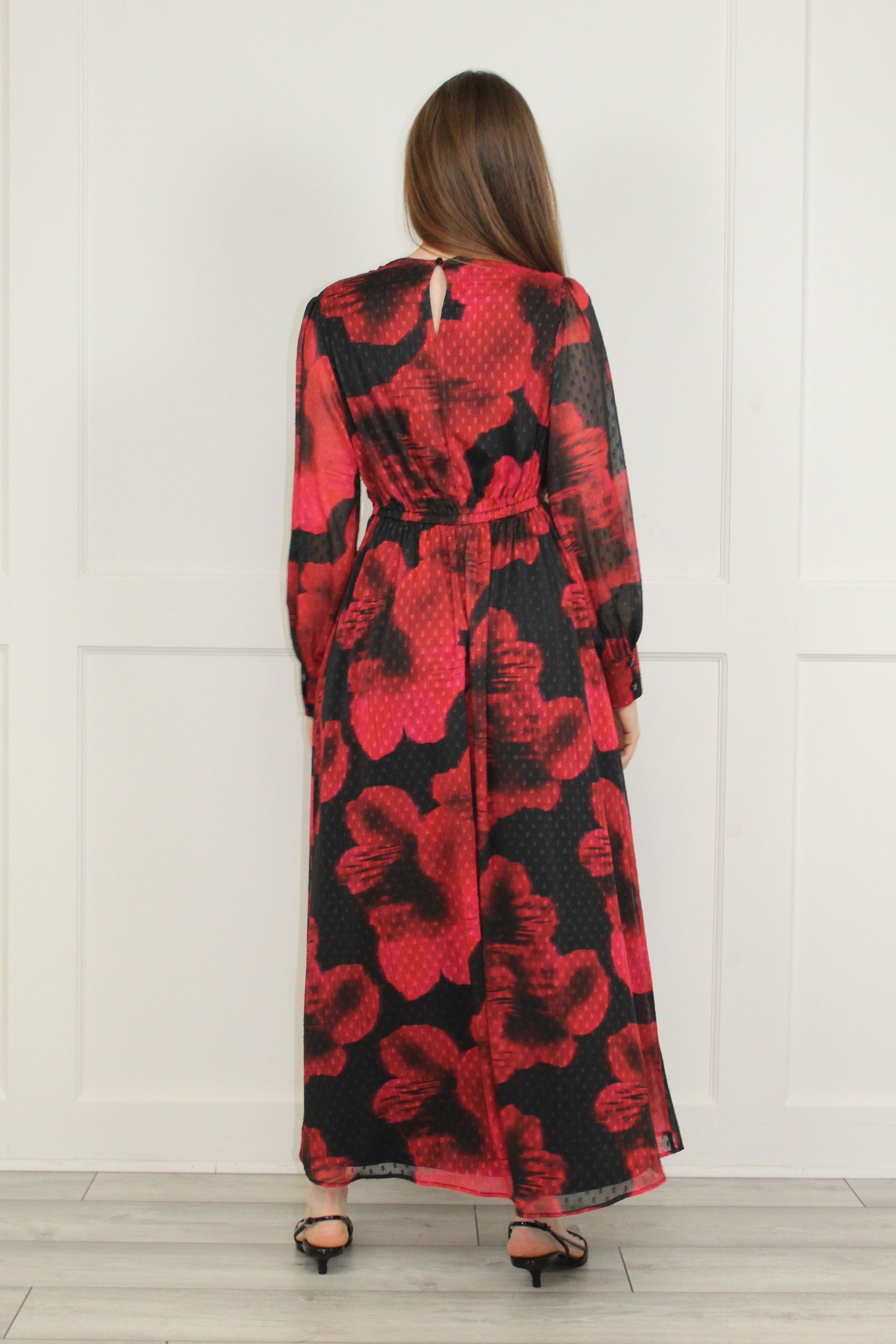 Textured chiffon midaxi dress in black and red floral print. This dress features a v neck, bust pleats, elasticated back, blouson sleeve with button cuff and flowing skirt. Pair this with your favourite pair of heels or boots for the perfect day to evening look.